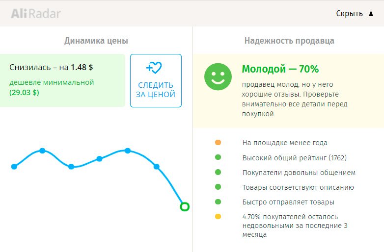 Еще лучше - пользоваться специальными сервисами типа Aliradar, которые могут устанавливаться в виде плагина к браузеру и прямо на странице товара показывать всякую полезную информацию: изменение цены, рейтинг продавца и другие данные.