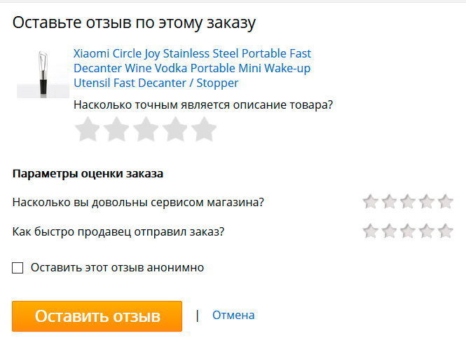 На Aliexpress стараются стимулировать покупателей оставить отзыв о товаре и продавце. Не ленитесь потратить несколько секунд и оценить заказ по трем параметрам - этим вы поможете другим покупателям. Ну и также после какого-то опыта использования данного товара поделитесь своим впечатлением о самом товаре.