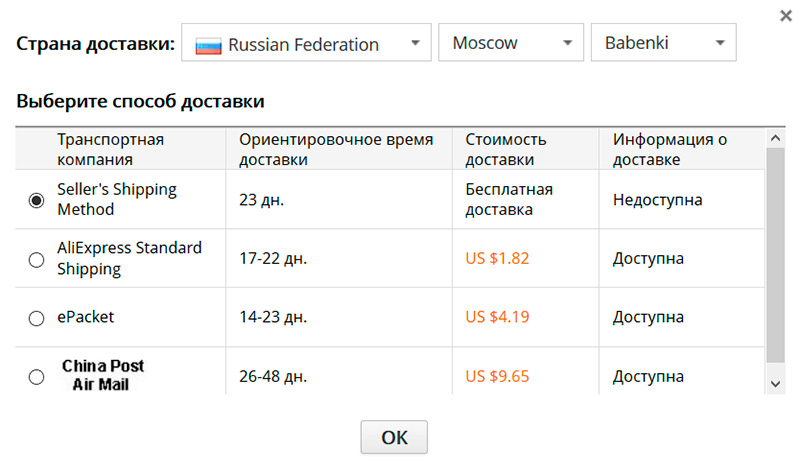 - Seller shipping method - тут как повезет, но этого способа не стоит боятся. Если вы покупаете товар дороше 10 долларов, то продавец не заинтересован отправлять его сомнительным способом, так как в случае чего покупатель открывает спор, а продавец теряет деньги. Часто за этим названием прячется бесплатная курьерская доставка, я довольно часто попадаю на такое.