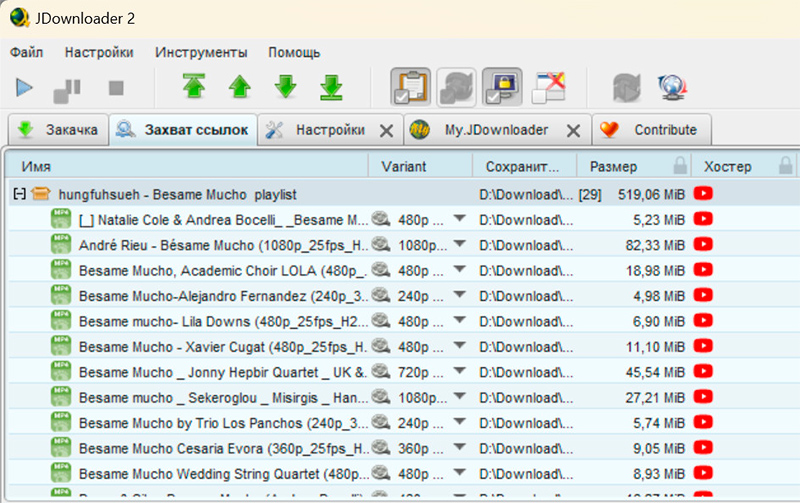 Также JDownloader 2 умеет работать с плейлистами YouTube: он предлагает скачать все видео плейлиста или конкретные.