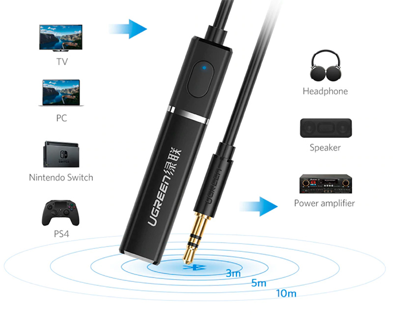 Ну и замечу, что область применения такого передатчика довольно широка. Для мини-джека он может подключаться к телевизору, персональному компьютеру, ноутбуку, игровым приставкам и геймпэдам. При этом звук может выводиться на наушники, беспроводные колонки и беспроводные усилители (есть такие, я сам такой использую - Creative Sound Blaster X7). Максимальная дальность - 10 метров, этого обычно вполне достаточно.