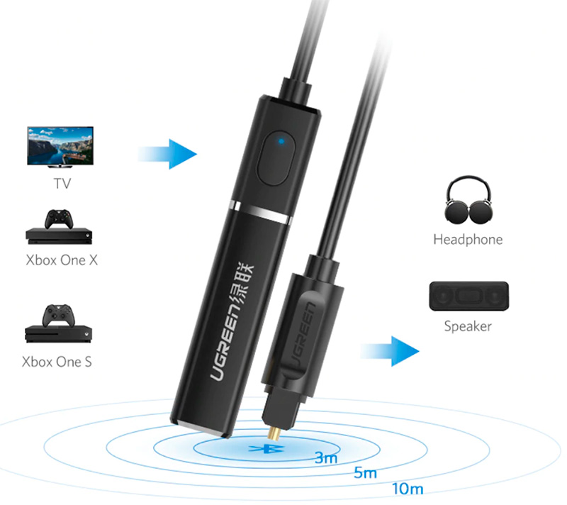 Вариантов обнаружилось совсем немного, мне из всего рассмотренного больше всего понравилась вот эта модель от известного производителя - Ugreen Bluetooth Transmitter 4.2. Она поддерживает aptX LL, так что качество звука должно было быть хорошим и без рассинхрона.