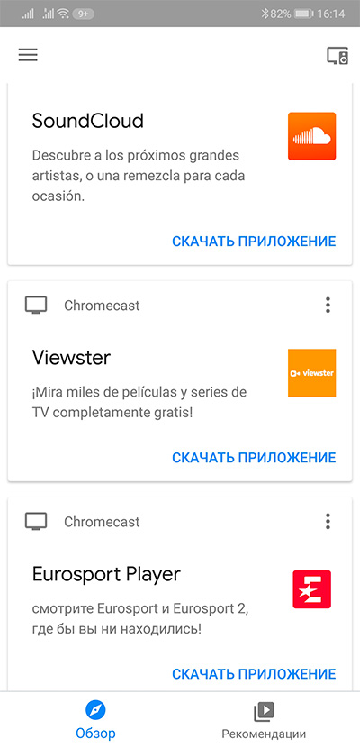 Также имеет смысл установить приложение Apps For Chromecast - там очень большой список программ с поддержкой Chromecast, причем их можно разбивать по категориям.