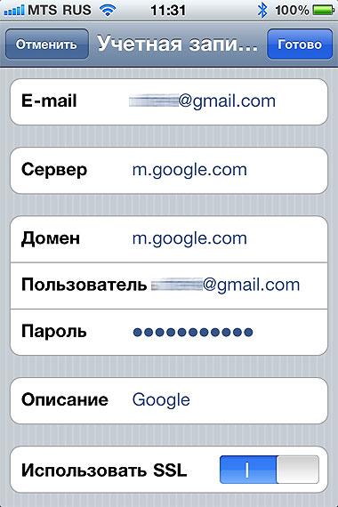 Настройки > Mail, Контакты, Календари > Добавить учетную запись > Microsoft Exchange (именно Exchange, а не Gmail, это важно!).
