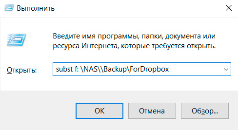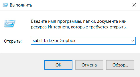 Сначала на том диске локального компьютера, где лежит папка Dropbox, создаем новую папку с каким-то именем - например, ForDropbox. Далее с помощью команды subst эту папку назначаем каким-то диском - выберите сами нужную букву, но имейте в виду, что после этого буква будет использоваться именно для папки Dropbox. Давайте это будет, например, диск F, если эта буква еще не занята.
