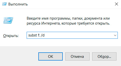 Команду subst вводим через окно "Выполнить" (клавиша Win+R). Разумеется, вы там указываете свои буквы дисков.
