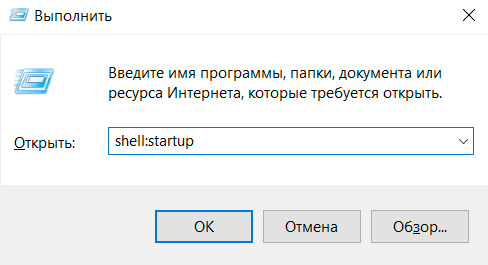 Теперь вам надо поставить его в автозагрузку. Можно сделать это через сценарии Windows, но проще по старинке - поместить ярлык на mystart.cmd в папку автозагрузок. В Windows 10 эту папку найти непросто, поэтому для быстрого доступа в окне "Выполнить" просто дайте такую команду и нажмите на ОК.