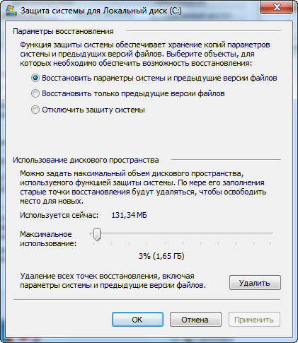 Windows 7 сохраняет системные настройки и предыдущие версии важных файлов, чтобы всегда можно было восстановить систему и файлы в случае каких-то проблем. Отключать эту службу не нужно, но в ней желательно ограничить используемое место на диске. Делается это следующим образом: