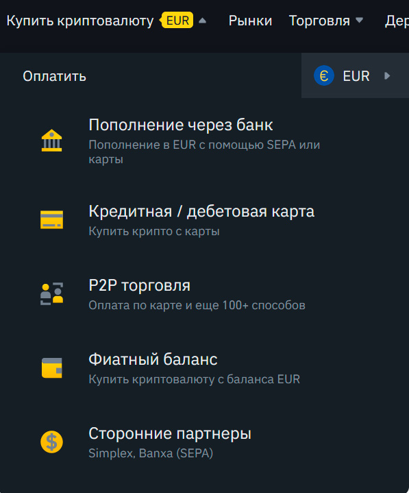 Купить криптовалюту можно несколькими способами: с помощью банковского перевода, оплатив банковской картой, с помощью P2P-торговли (тут поддерживается огромное количество вариантов оплаты).