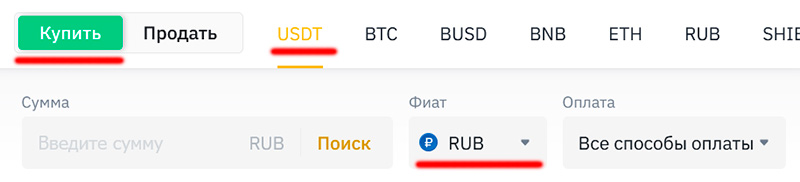 Внимательно смотрим на верхнее меню. Мы что делаем? Покупаем, а значит, должно быть выделено "Купить". Что мы покупаем? Криптодоллары (USDT) - они должны быть выделены. За что мы покупаем? За рубли - в разделе "Фиат" нужно выбрать рубли.