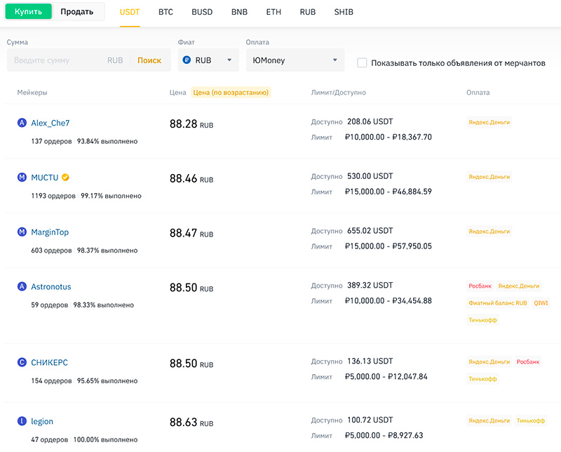 Ник продавца, количество сделок, процент выполнения, цена продажи (от самой выгодной), сколько денег доступно, какие виды оплаты принимаются (ЮMoney там по-старинке именуются "Яндекс.Деньгами"). При сильных ограничениях (только рубли и только ЮMoney) предложений будет не особо много, да и количества USDT у продавцов, как правило, небольшие, однако если вы выберете все способы оплаты, то там уже будут намного большие количества USDT у одного продавца и заметно ниже курс продажи - вот, например.