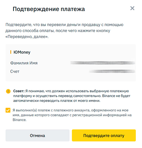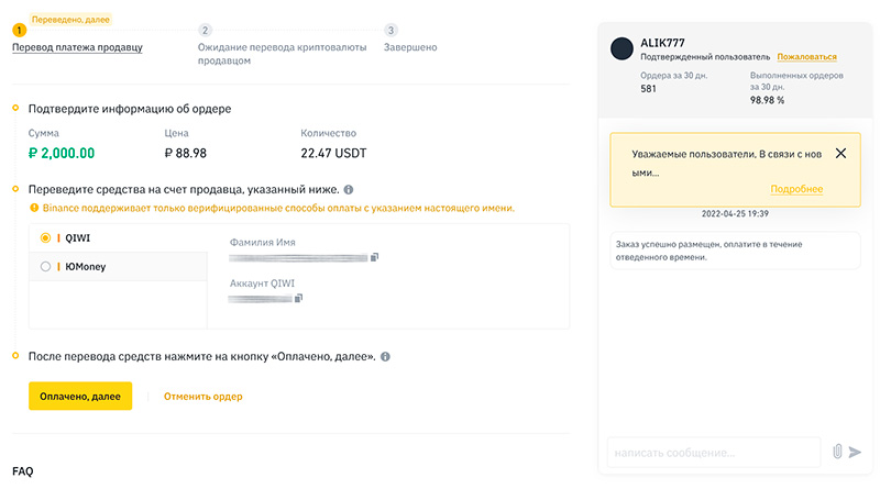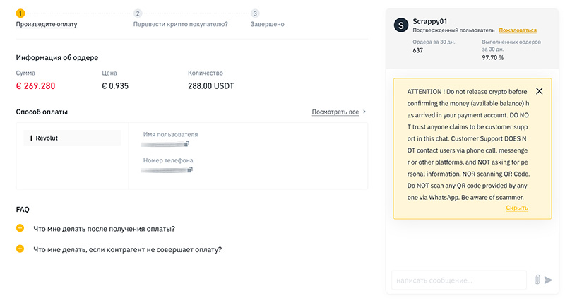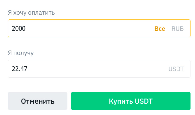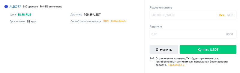 Предположим, выбрали продавца, нажали кнопку "Купить USDT". Появляется вот такое окно.