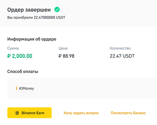 Нажимаем "Купить USDT". Появляется карточка заказа (так называемый ордер). Сумма, сколько получите, информация о продавце, выбор вида оплаты (если выбор вообще есть).