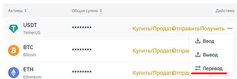 Как это сделать? Меню "Кошелек - Пополнения", где у нас лежат купленные криптодоллары, в строке нашей криптовалюты нажимаем меню (три точки) и там пиктограмму "Перевод". (Там в табличке много столбцов, я в скриншоте сократил.)
