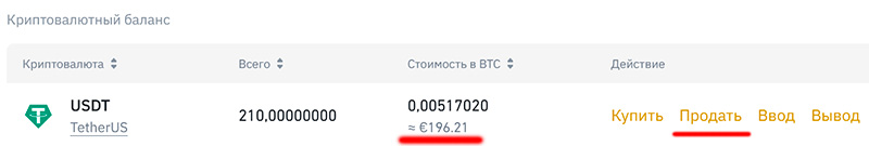 В списке ищем наши криптодоллары (они на первой строчке), и там нам нужен пункт "Продать" (колонки я сократил).
