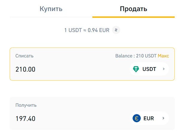 Нажимаем на "Продать", попадаем в окно продажи криптовалюты. Выбираем евро, вводим нужную сумму USDT (можно нажать на Max, чтобы ввелась вся сумма).