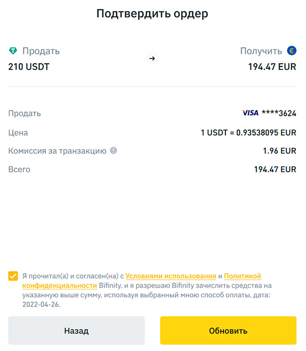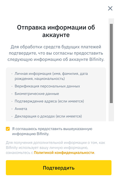 Карту выбрали, переводим. При первом переводе биржа потребует от вас согласия на предоставление сведений.