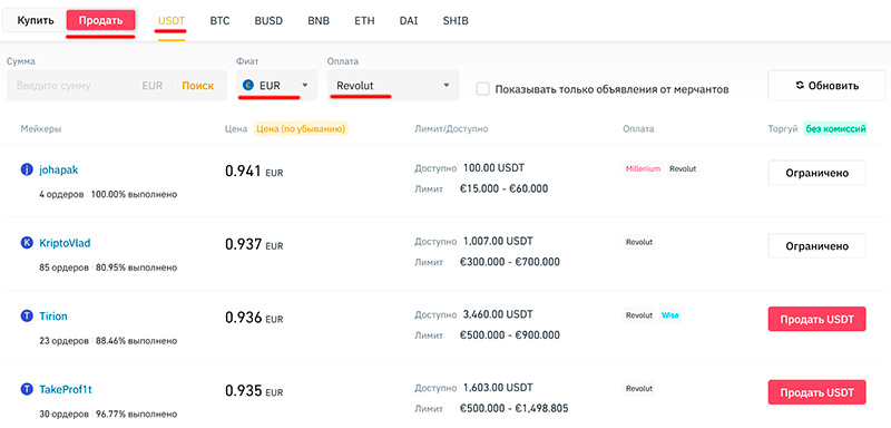 Верхний пункт меню биржи "Купить криптовалюту - P2P-торговля". Там нажимаем кнопку "Продать", выбираем USDT, в качестве фиата задаем EUR, ну и в способе оплаты выбираем желаемое - Revolut, Wise, банковский перевод, перевод по карте и так далее и тому подобное.