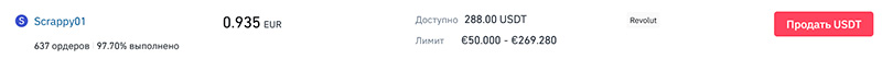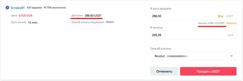 Выбрали продавца, нажимаем "Продать USDT". Там в "Доступно" указано, сколько он может купить, в разделе "Я хочу продать" указан ваш баланс USDT, там вы вводите сумму продажи (можно нажать на "Все", чтобы продать максимум, который купит ваш покупатель), указано, сколько евро вы получите и на какой счет - в данном случае на карту Revolut.