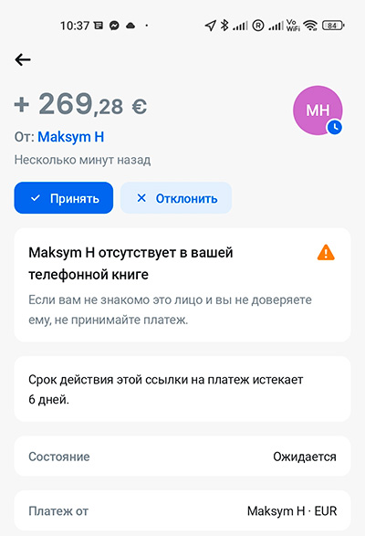 Обычно деньги приходят в течение одной-двух минут - вот уже поступили. Ну и, понятное дело, их нужно принять, нажав на соответствующую кнопку.