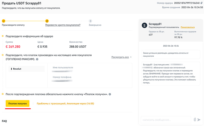 После поступления денег в чате система вам пришлет сообщение с настоящим именем продавца, появится кнопка "Платеж получен", которую вы должны нажать, после чего биржа с вашего счета переведет криптовалюту на счет покупателя, запросив у вас при этом отправленный на телефон код. (Я очень рекомендую сразу подключить проверку через Google Authentificator, чтобы не связываться с SMS.)