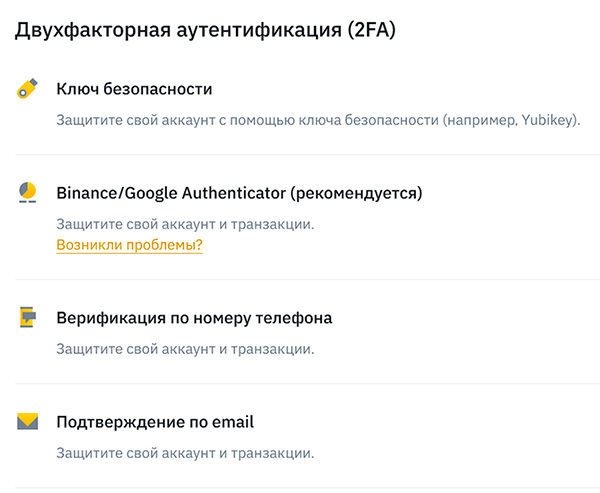 Binance/Google Authentificator - аутентификация через приложение Binance или Google Authentificator (это приложение многими сервисами используется).