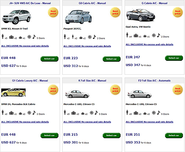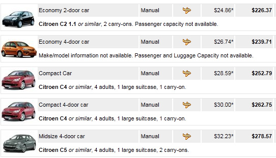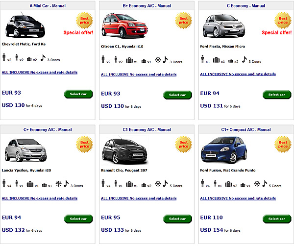 Посмотрите эту табличку и сравните цены с верхними табличками. Там классы A и B только начинались от $218. Здесь же вам их дают за $130 - почти в два раза дешевле! Кстати, здесь еще и опции вроде детского кресла, второго водителя, и возможности поездки в другую страну будут заметно дешевле. (Второй водитель вообще добавляется бесплатно.)