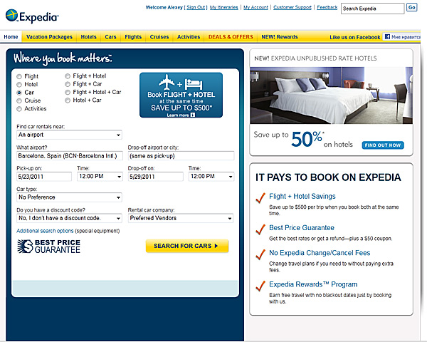 Раньше я для этой цели пользовался довольно известным сайтом Expedia.com. (Его же можно использовать для бронирования отелей, круизов и так далее.)