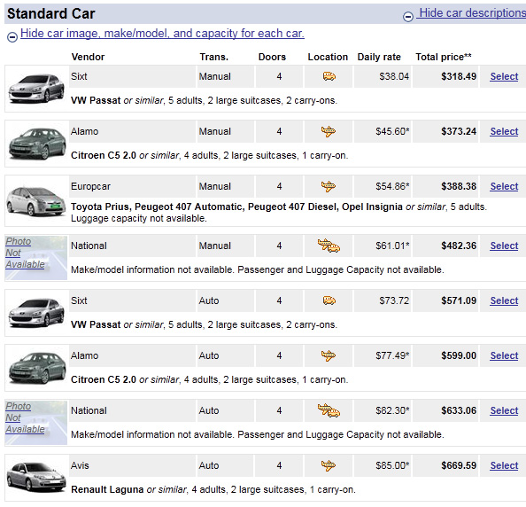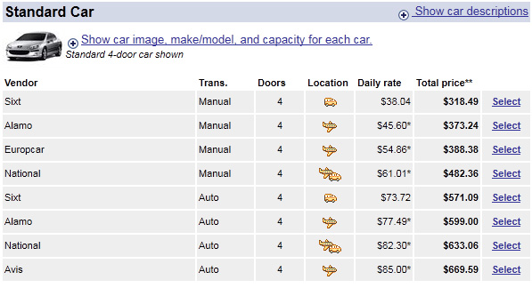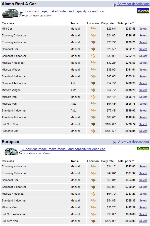 Тут удобно то, что Expedia умеет выдавать по каждой прокатной конторе полный спектр классов машин и дает по ним цены. (Режим Preferred vendors.)