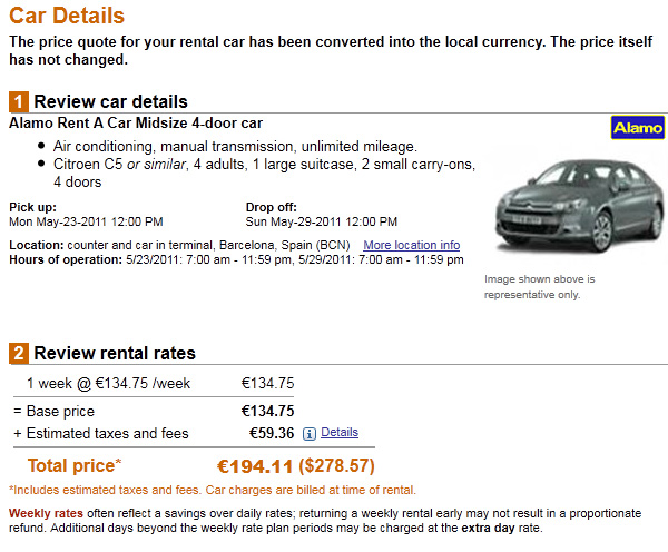 Вот, например, сравнение Alamo и Europcar. (Для примера я брал неделю с 23 мая 2011 года по 29 мая в аэропорту Барселоны.)