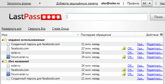 Все ваши данные LastPass автоматически сохраняет в вашем профиле у себя на сайте, давая гарантию, что эти данные кроме вас не будут доступны никому. С одной стороны, это очень удобно, потому что, во-первых, вы можете манипулировать со своими данными прямо на сайте с любого компьютера, во-вторых, эти данные с легкостью переносятся между компьютерами и разными платформами, в-третьих, ваши данные автоматически бекапятся.