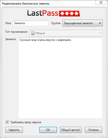 Доступ к защищенным заметкам (к каждой в отдельности) можно давать своим друзьям, для чего в вашем профиле на сайте LastPass вбивается соответствующая информация (e-mail друзей), а им потом приходит сообщение. Впрочем, чтобы посмотреть эти заметки, друзья должны будут создать свои аккаунты на LastPass.