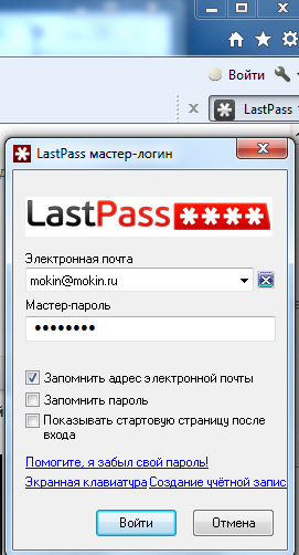 Теперь LastPass установлен в ваших браузерах. В правом верхнем углу MSIE (FireFox, Chrome) появится панелька LastPass. При щелчке по ней возникает форма входа.