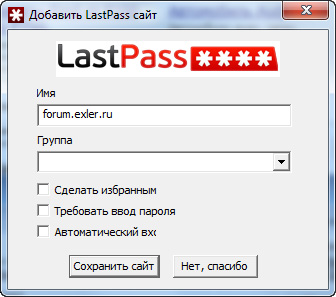 Имя сайта - это его интернет-адрес. Группа - это если вы хотите делить сайты на различные группы, чтобы понимать, что к чему относится. "Требовать ввод пароля" - это сохранить логин без пароля. И еще интересная опция "Автоматический вход" - если ее отметить, то теперь при входе на этот сайт LastPass будет автоматически вбивать нужные данные и входить на сайт.