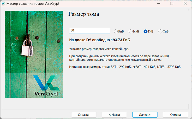 Важный момент - задание размера контейнера. Там всё удобно - задаете килобайты, мегабайты, гигабайты или терабайты (русский интерфейс - кривоватый, да, но мы это переживём), после чего указываем объем. На самом деле контейнер может иметь и динамический объем, увеличивающийся при заполнении, но лучше сразу определиться, какого размера этот контейнер будет и где будет храниться.