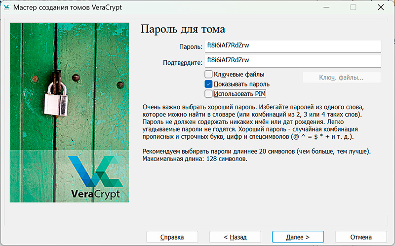 Следующий шаг - задание пароля. Понятно, что для защищенного контейнера пароль должен быть уникальным (который используется только для данного контейнера) и устойчивым. Он должен состоять не менее чем из 10-12 символов (а лучше из 14-16 символов), в нем не должны использоваться обычные слова, в нем обязательно нужно использовать символы в разных регистрах. Идеальный вариант - сгенерировать пароль с помощью генератора устойчивых паролей и сохранить его в менеджере паролей. (При этом само приложение VeraCrypt рекомендует использовать пароль не менее 20 символов.)