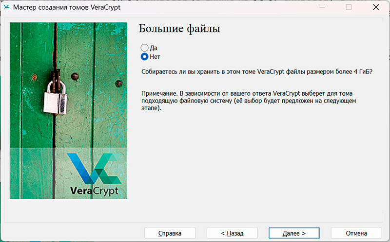 На следующем этапе нам задают вопрос, планируем ли мы хранить в этом контейнере файлы размером более 4 ГБ - это повлияет на выбор файловой системы для контейнера. Лучше выбрать "Да", а то мало ли, вдруг понадобится.