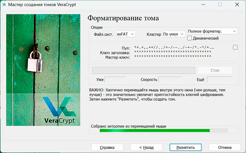 После этого появляется окно форматирования нашего контейнера, при этом прежде чем нажать кнопку "Разметить", вам нужно некоторое время хаотично перемещать курсор мыши внутри этого окна, пока индикатор внизу окна не станет зеленым - это нужно для повышения криптостойкости ключей шифрования.