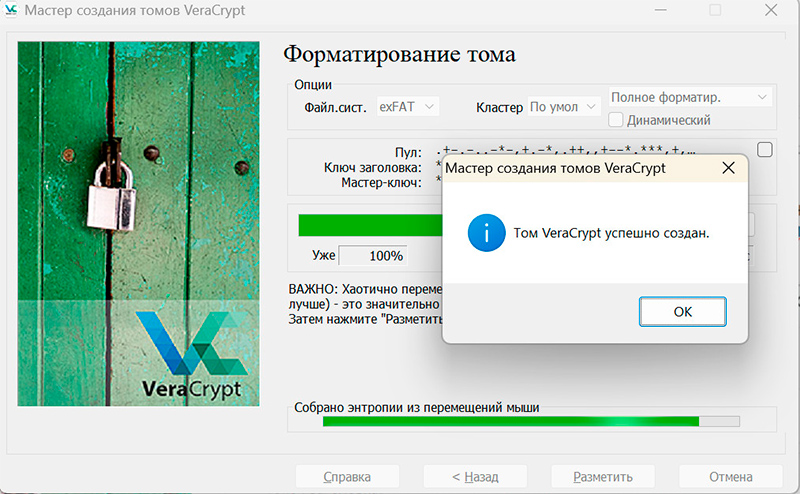 Когда индикатор станет зеленым, нажимаем "Разметить". Процесс форматирования идет очень быстро - со скоростью 2-3 ГБ в секунду, ну и по окончании VeraCrypt выдаст сообщение о том, что контейнер создан.