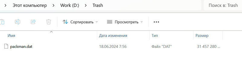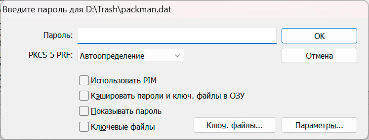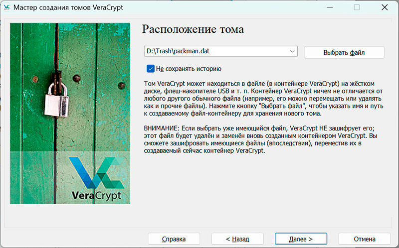 Далее выбираем расположение тома (файла): он может быть на логическом диске, на флешке, на внешнем диске, на NAS и так далее - где угодно, потому что это просто один файл. Для затруднения идентификации посторонними лучше задать папку с максимально безликим названием, типа "Всякий мусор", или же "Письма тещи" - сами придумайте, что будет максимально безлико, ну и файлу дать название из серии "packman.dat" или что-то в этом роде, потому что ни имя, ни расширение не играют никакой роли, они просто должны быть максимально безличными - никаких "Важные документы", "Конфиденциальные данные", "От этого зависит моя жизнь" и всё такое.