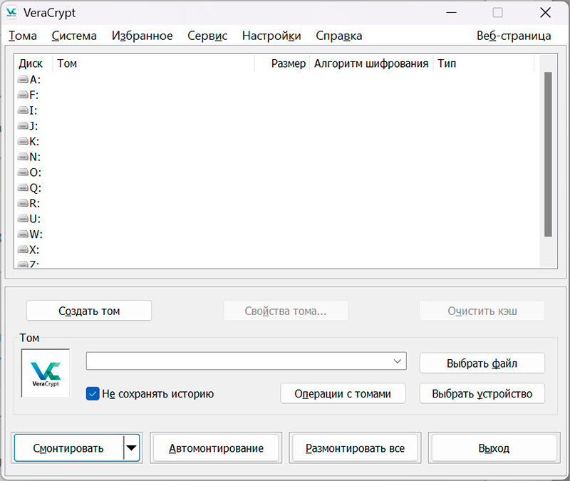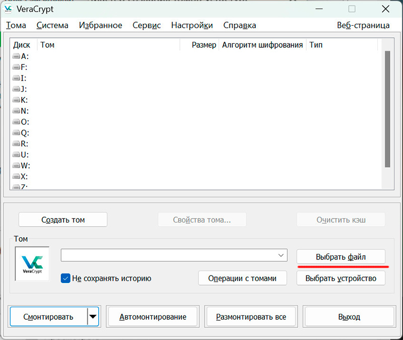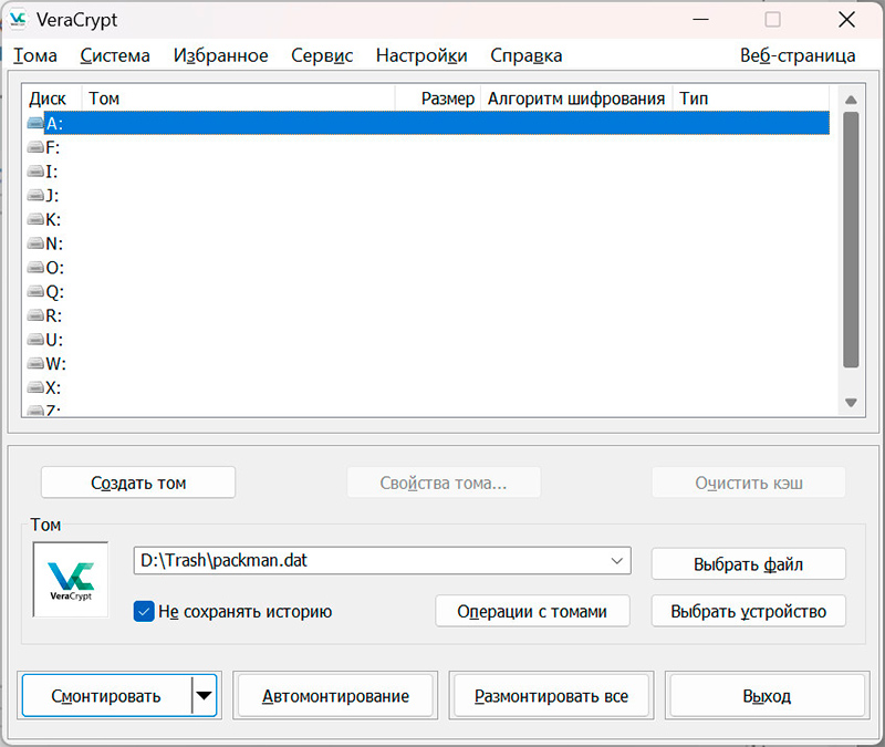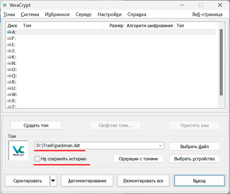 Тут сразу возникает два вопроса. Первый. Ну, хорошо, смонтировали том, поработали с ним, размонтировали. Но при следующем запуске VeraCrypt показывает имя нашего контейнера - и зачем тогда мы его прятали? Ну да, показывает. Потому что вы не отметили опцию "Не сохранять историю". Если ее отметить, то никакие имена контейнеров запоминаться не будут.