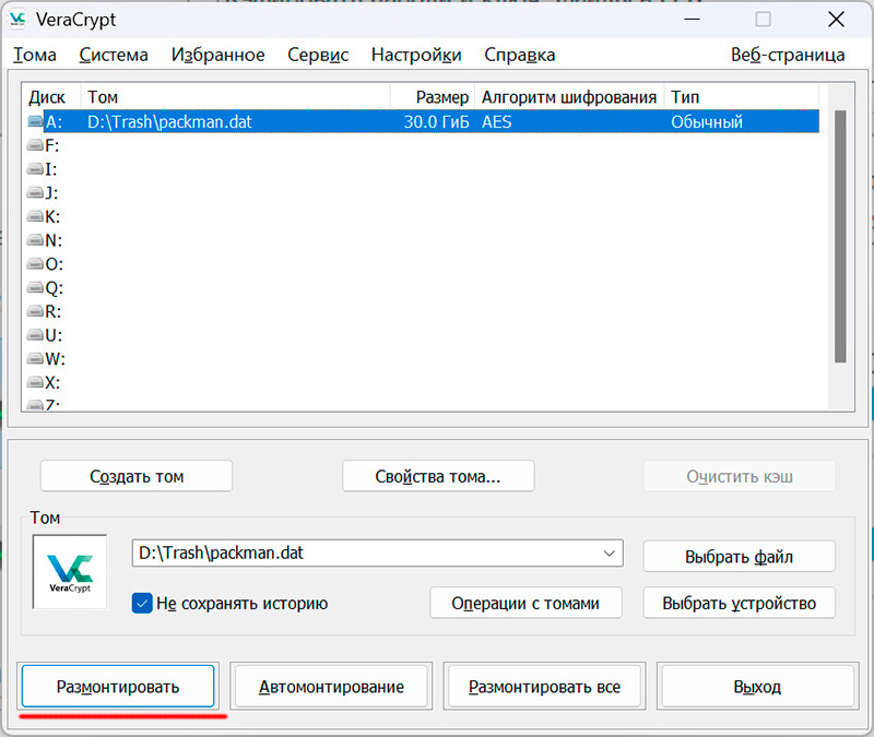 Скопировали туда все что нужно, закончили работу с контейнером. Теперь, чтобы его снова закрыть, контейнер нужно размонтировать. В окне VeraCrypt показаны все ваши смонтированные контейнеры. Вы можете размонтировать сразу все - специальной кнопкой, - можете выбрать конкретный том и размонтировать его.