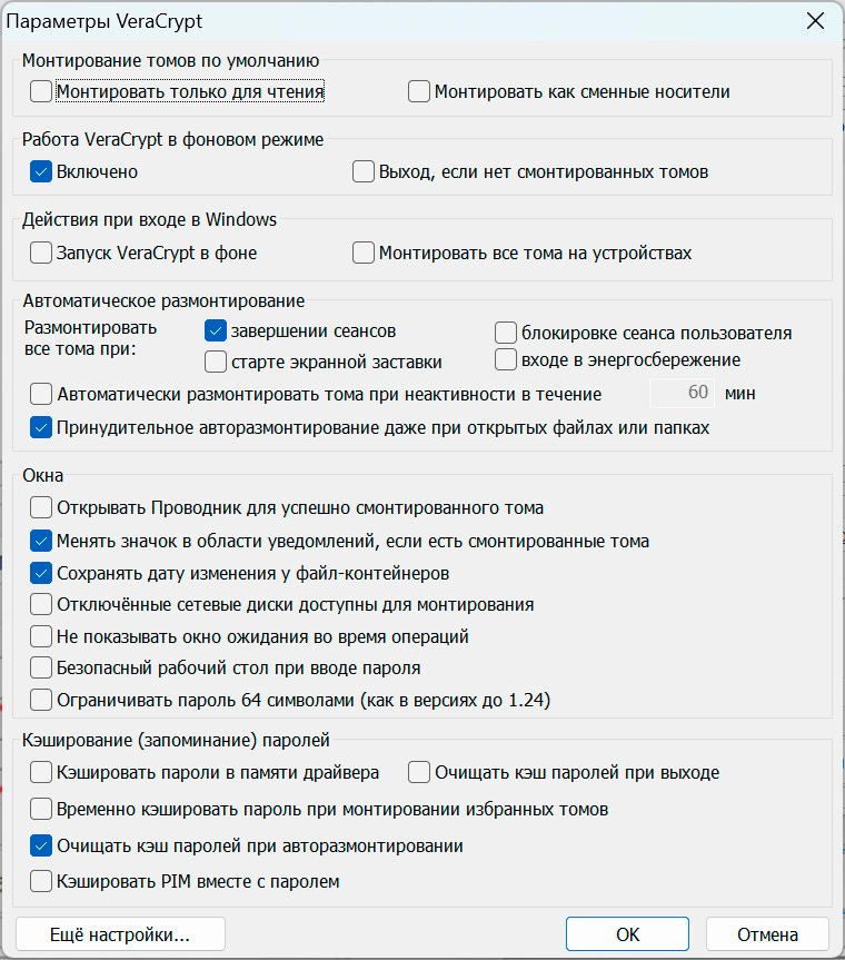 Второй важный момент - вы можете использовать авторазмонтирование тома. Давайте заглянем в "Настройки - Параметры" этого приложения. Видите пункт "Автоматически размонтировать тома при неактивности в течение"? Отмечаете эту настройку, задаете временной промежуток - например, 30 минут или 60 минут, и контейнеры будут автоматически размонтироваться, если вы ими не пользуетесь в течение какого-то времени. Также тут можно задавать автоматический запуск VeraCrypt и автоматическое монтирование всех ваших томов (разумеется, соответствующие пароли будут запрашиваться).