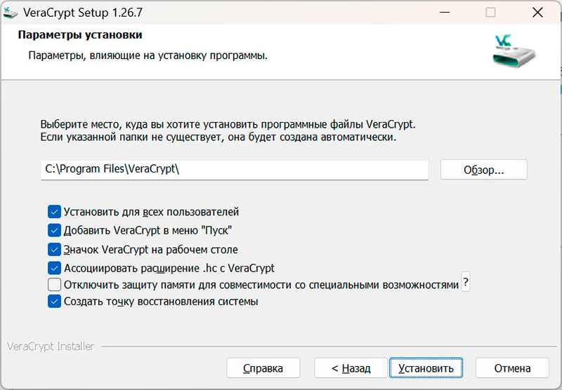 Кроме того, в VC есть функция обфускации ключа шифрования в памяти, что сильно затрудняет атаки, когда компьютер захватили включённым (но заблокированным) или выключенным, но в состоянии гибридного сна или гибернации.