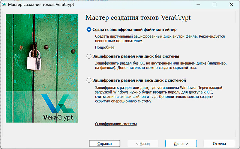 В данном случае мы хотим создать зашифрованный файл-контейнер, так что выбираем опцию по умолчанию.