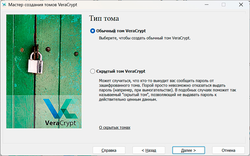 Дальше выбирается обычный или скрытый том - для большей безопасности.