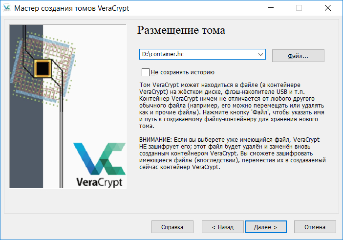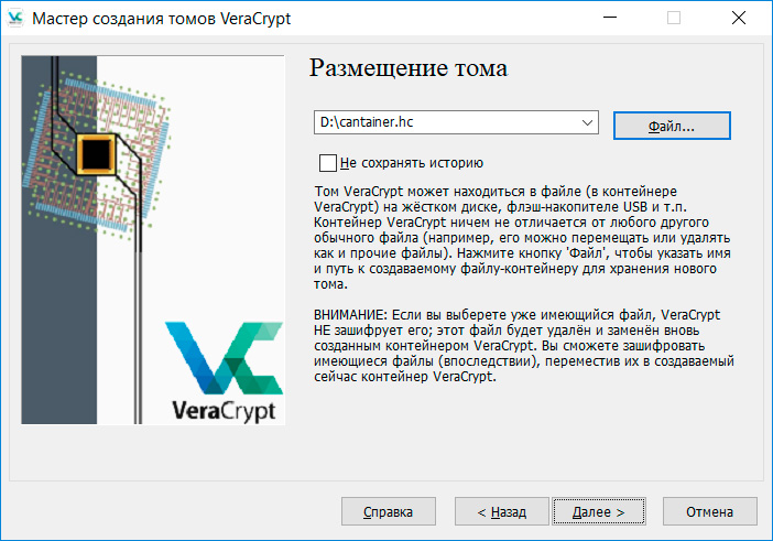 Теперь нужно дать название контейнеру и указать, где его разместить. Он будет представлять собой обычный файл с данными, и в дальнейшем вы его можете размещать где угодно. Для своих контейнеров VeraCrypt использует расширение "hc", однако в целях сокрытия контейнеров от посторонних вы можете задавать там любые другие расширения - например, "dat".