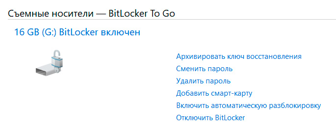 Если вам понадобится сменить пароль или отключить шифрование - на подключенной флешке нажать правую кнопку мыши и там "Управление Bitlocker".