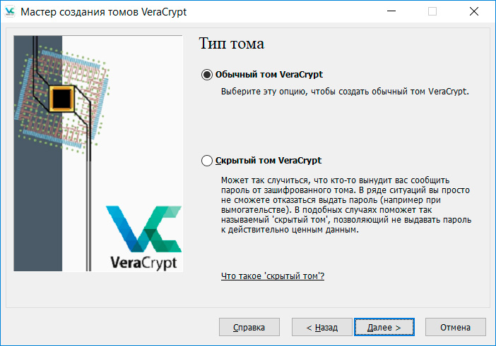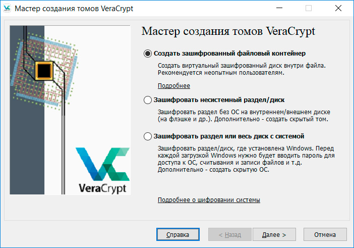 Для создания защищенного контейнера нажмите кнопку "Создать том". В следующем окне нужно выбрать создание зашифрованного файлового контейнера. Обратите также внимание на то, что программа умеет шифровать целиком несистемные и системные диски и разделы.