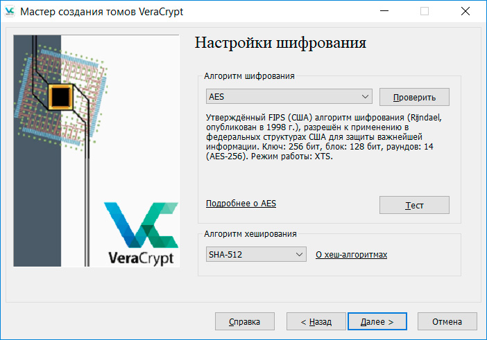 ПС: в качестве алгоритмов шифрования для контейнеров лучше использовать те, которые поддерживаются аппаратно процессором (обычно это AES), а то в случае использования экзотичных алгоритмов можно столкнуться с падением производительности при работе с контейнером.